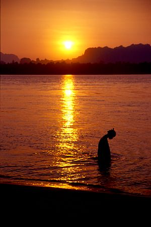 Woman bathing in Thanlwen river in Hpa-AnFrau beim Baden im Thanlwen Fluss in Hpa-An
